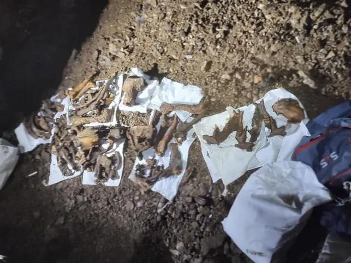 “洞穴很深,我们垂降了大概130米才到底部。”张国强说,他们来到洞底后,又横向上坡行走了数十米,在穿过一个仅容人侧身爬过的缝隙后,发现洞内只有一块空地,随后折身准备离开。返回途中,他们在缝隙附近发现了一堆动物骨头,下颌骨清晰可见。