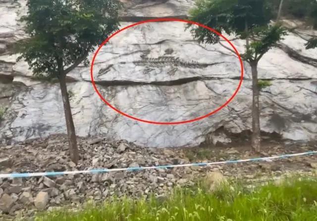 近日,一名网友发布视频称,贵州省兴义市万峰林附近一山体惊现一块完整的恐龙化石。视频中,恐龙化石附着在山体上,周围散落一地碎石,现场拉起了警戒线。