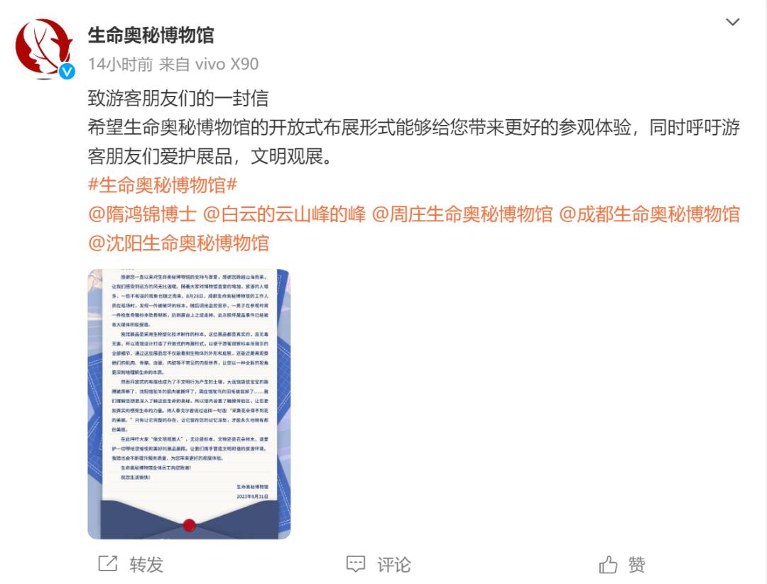 博物馆在信中表示:开放式的布展也成为了不文明行为产生的土壤,大连馆袋鼠宝宝的胳膊被弄断了,沈阳馆驼羊的肌肉被撕坏了,周庄馆鸵鸟的羽毛被拔掉了......我们理解您想更深入了解这些生命的奥秘,所以馆内设置了触摸体验区,让您更加真实的感受生命的力量。
