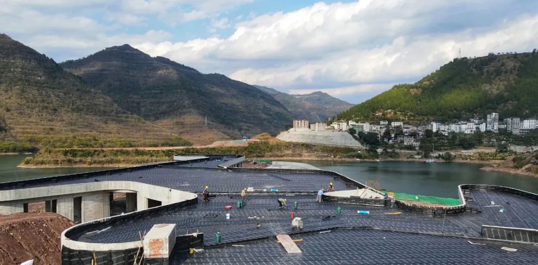 年末岁尾,来到云阳恐龙国家地质公园,各节点施工现场依然是一片繁忙的施工景象。在位于普安乡丰河村的东部游客接待中心,20多名工人正抓紧进行屋面防水层施工。