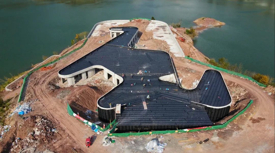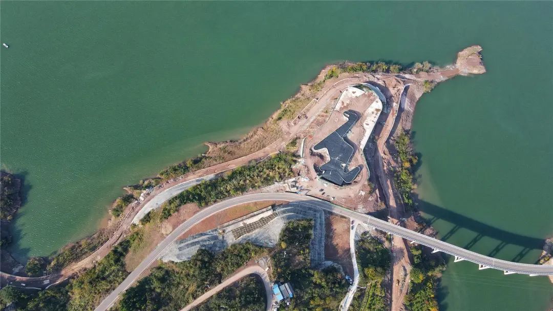 始建于2022年11月的东部游客接待中心已初具雏形,即将进行内部装修和园建,空中俯瞰其主体建筑群,犹如一只行走在河畔的可爱恐龙。