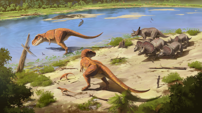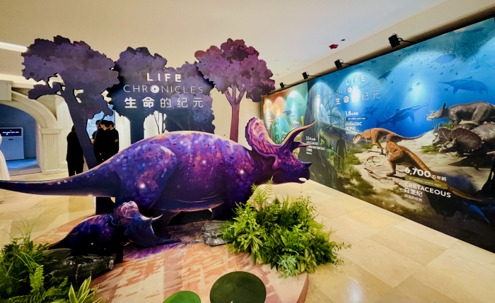 从太古宙(距今35亿年前)生命最初迹象、寒武纪(5.22 亿年前)动物生命起源,石炭纪(3.14亿年前)壮观森林形成、白垩纪巨型恐龙时期(6700万年前),到人类生命的崛起(10万至6万年前)……这些史前地貌景致呈现了不同时期、不同地区和各类生命物种,帮助观众感受并理解多重生命形态的无处不在、无时不有。